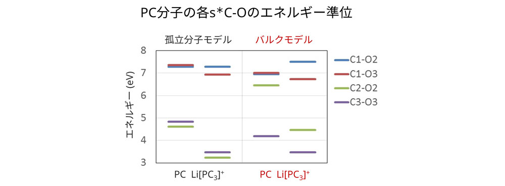 The effect of the surrounding group of molecules causes a large variation in the order of the energy levels of the antibonding orbitals of the PC molecule