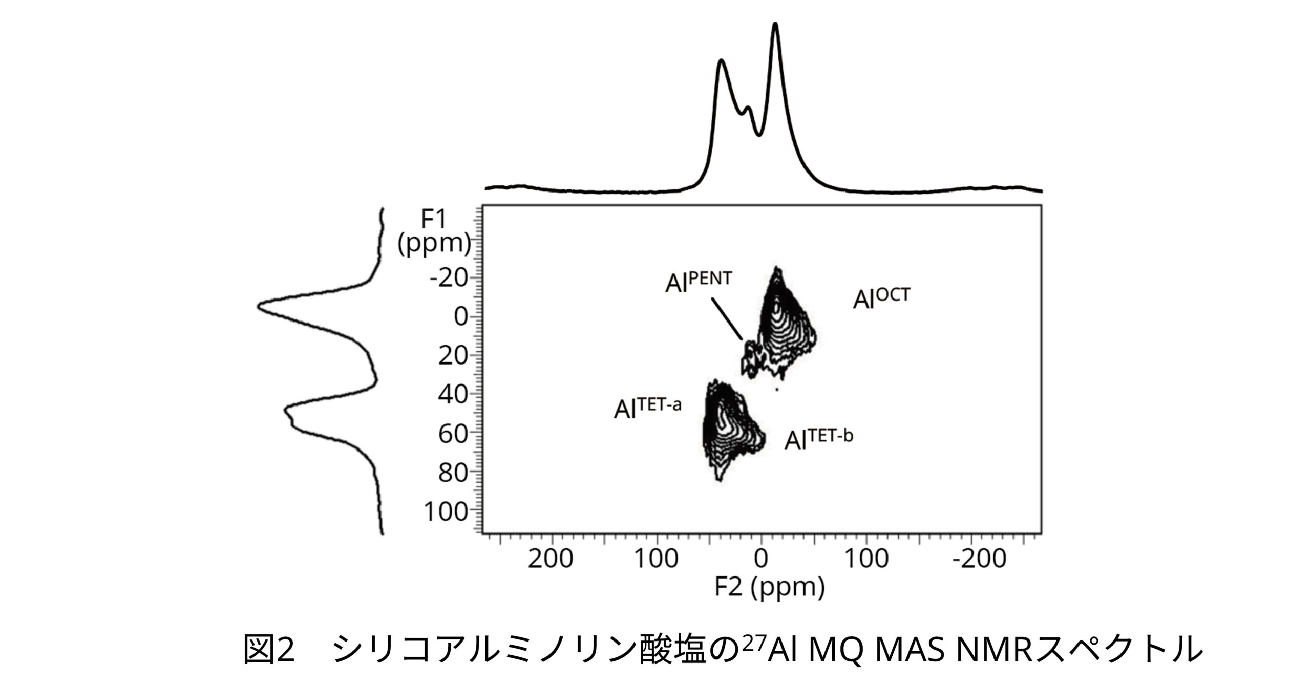 F2(σ2)軸の低磁場から4配位、5配位、6配位のピークが検出されました。F1(σISO)軸に着目すると、4配位のAlについては線幅の狭いスペクトル (AlTET-a) と線幅の広いスペクトル (AlTET-b) が観測されており、一元スペクトルでは判別のできなかった2種類の4配位Alの存在を確認することができました。