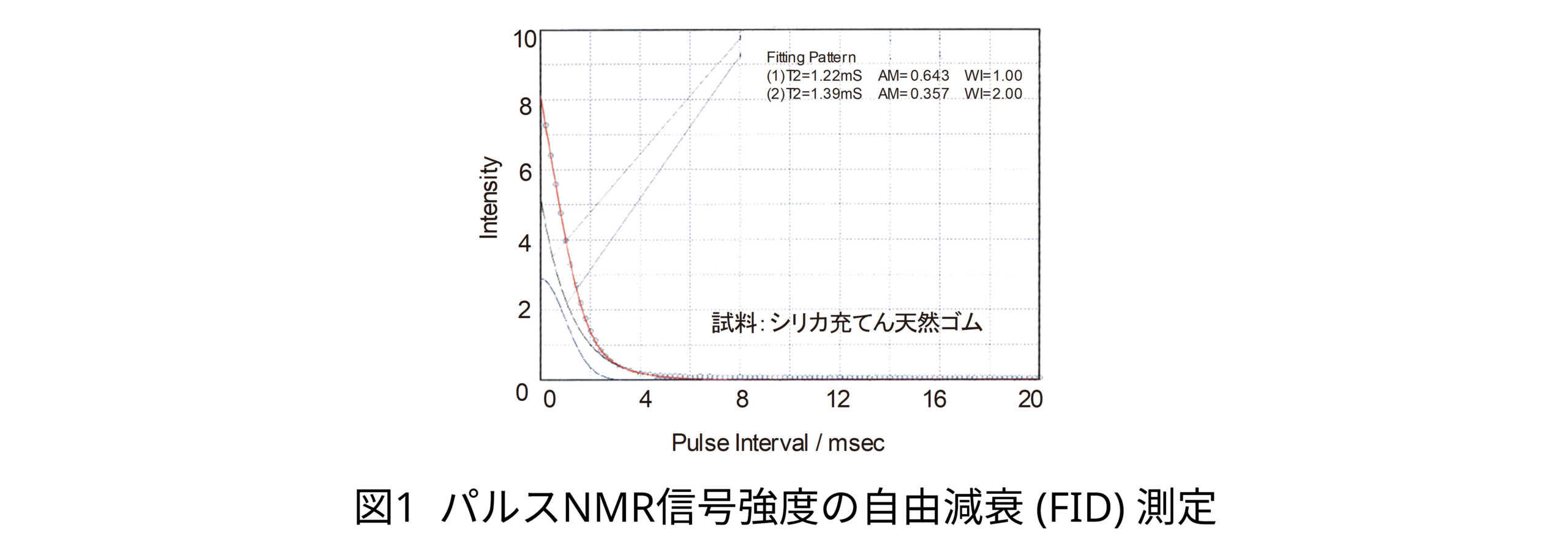 シリカ充填天然ゴムで測定されたFIDを図1に示します。FIDの減衰速度は分子レベルでの運動性を反映しており、FIDの変化する様子から種々の緩和成分 (T2a, T2b等) およびその分率を求めることができます。