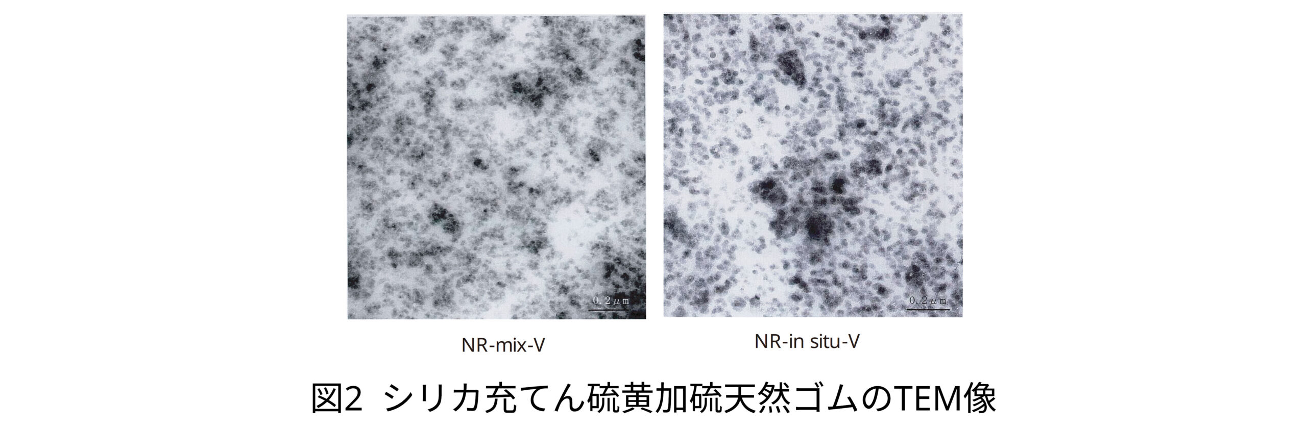 それらのシリカの凝集構造をTEMで観察した画像を図2に示します。両試料におけるシリカの分散状態の相違が観察され、NR-mix-Vに比べ、NR-in situ-Vの方がシリカ粒子径が大きいことがわかります。