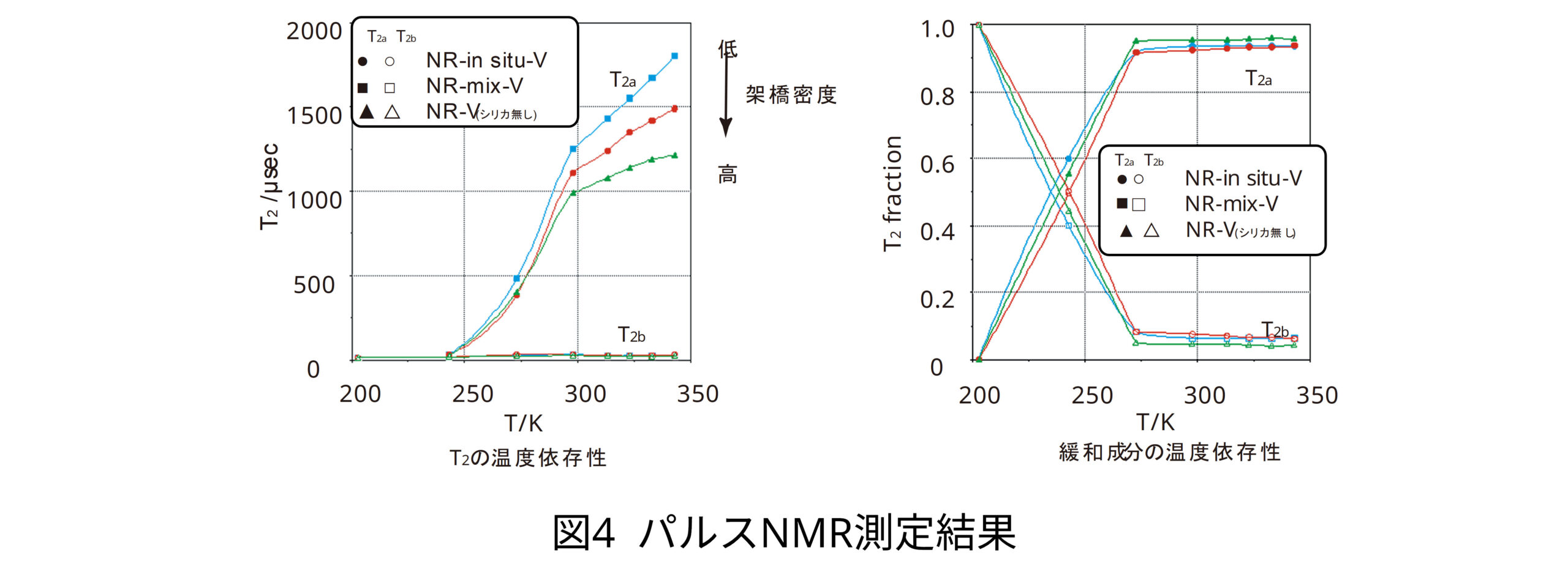 パルスNMRでの測定結果を図4に示します。結果から長い緩和時間T2aと短い緩和時間T2bが確認できます。前者はマトリックスであるゴムの分子運動性を、後者はシリカ/ゴム界面の分子運動性を反映するものと考えられます。
