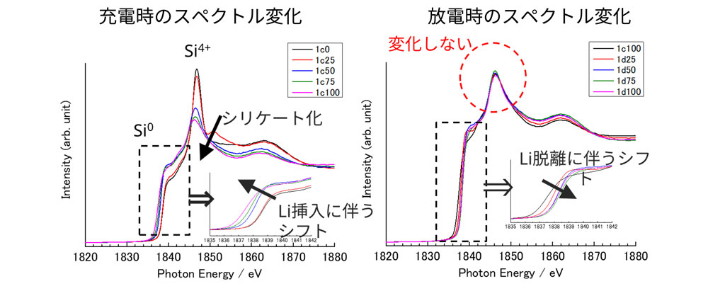 ・充電に伴いSiO2のピークが低エネルギー側にシフト (シリケート化) し、この変化は不可逆であることが確認されました。