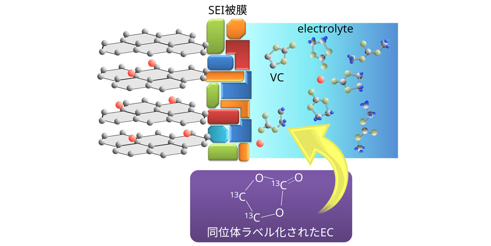 VC添加により、ECの分解を抑制するとともにECの炭酸Li化も抑制することが確認されました。さらに、ECを起源とする被膜の重合化される様子が示唆されました。