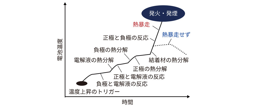 正極活物質は高温になると酸素ガスを放出する熱分解を起こし、ただちに発熱します。さらに電池温度が上昇し熱暴走が進むと場合によっては発火や発煙を起こす要因にもなり得ます。