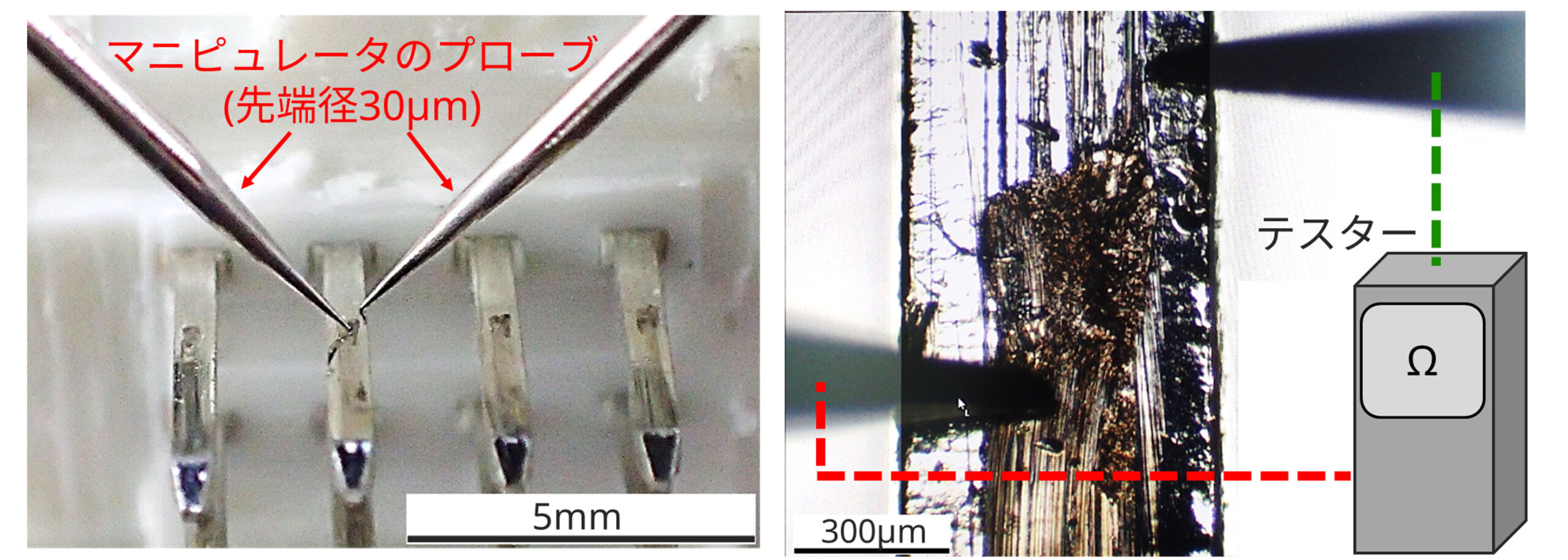 導通不良部には付着物、摺動痕などが見られますが、不良箇所の特定は原因究明において最重要事項です。しかし観察ではどこの部位が不良箇所なのか特定できないことがあります。また導通確認を行おうとしても不良箇所が微小なため、プローブが太い通常のテスターでは困難です。当社では、微細作業が行えるマニピュレータにテスターを接続して導通試験を行い、不良箇所を特定してから各種分析を行います。
