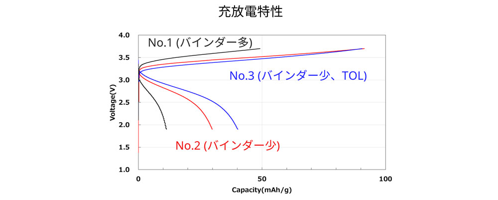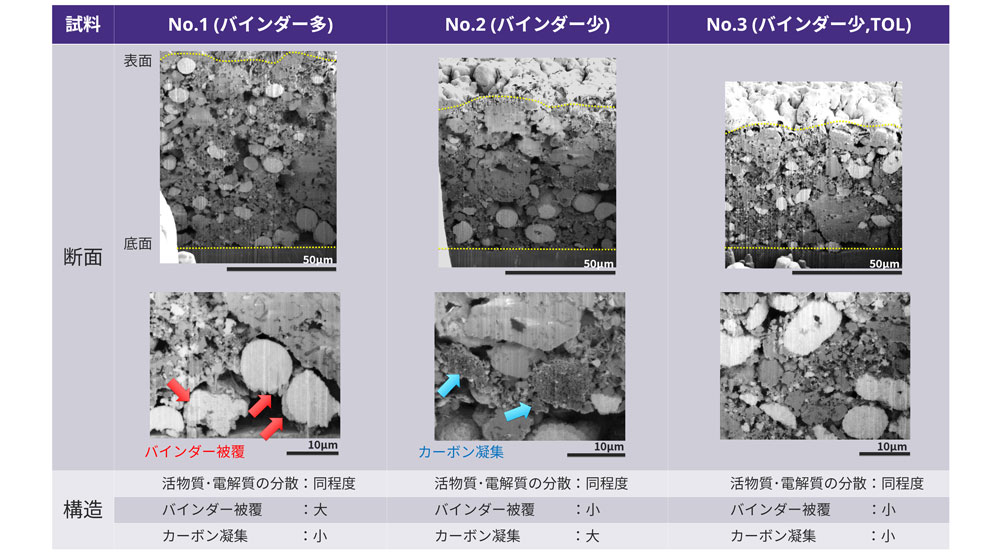 その結果、バインダーおよび導電助剤カーボンの分散に違いがあることが認められました。各部材の分散性が良いスラリーが合材電極のLiイオンや電子のパスを良好にし、電池性能を向上させると考えられます。
