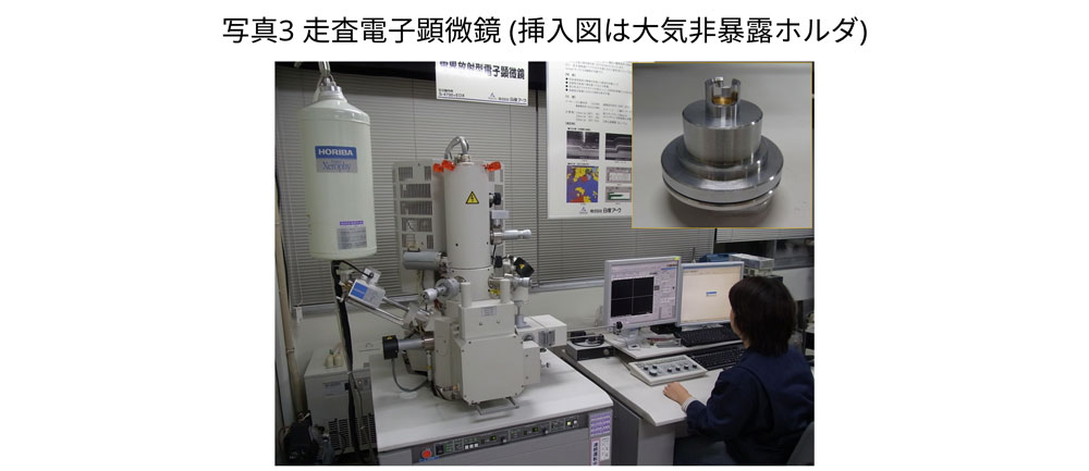 SEM (走査電子顕微鏡) 観察 (写真3) は専用の大気非暴露ホルダを用い (写真3挿入図) 、大気に曝すことなく行っています。