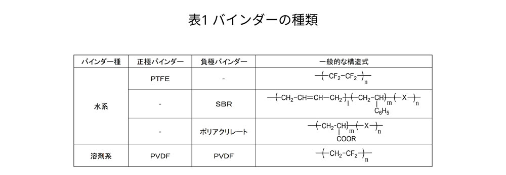 バインダーは、活物質や導電助剤、集電箔を結着させるために用いられます。バインダー自身は直接的には素反応に関与しませんが、活物質表面や粒子間に多く存在しています。そのため、電池の素反応においてその存在が無視できない材料です。