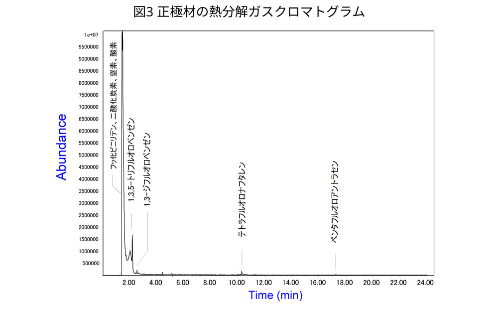正極からは、フッ化ビニリデン、1,3,5-トリフルオロベンゼン、テトラフルオロナフタレンおよびペンタフルオロアントラセンが検出されました。これより、バインダー樹脂種はポリフッ化ビニリデン (PVDF) と推定されます。また、負極からは、1,3-ブタジエン、トルエン、スチレンおよびα-メチルスチレン等が検出されました。これより、バインダー樹脂種はスチレン-ブタジエンゴム (SBR) と推測されます。