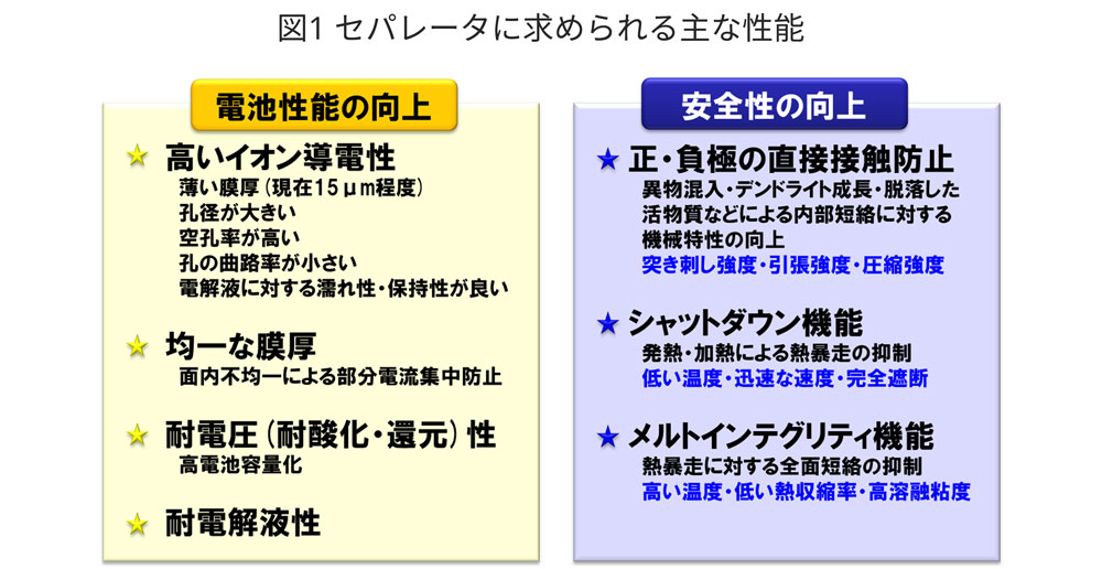 セパレータは、薄皮一枚で電池の安全性をになっていると同時に電池性能にも影響を与えるため様々な性能が要求されます。図1に、セパレータに要求される主な性能を示します。