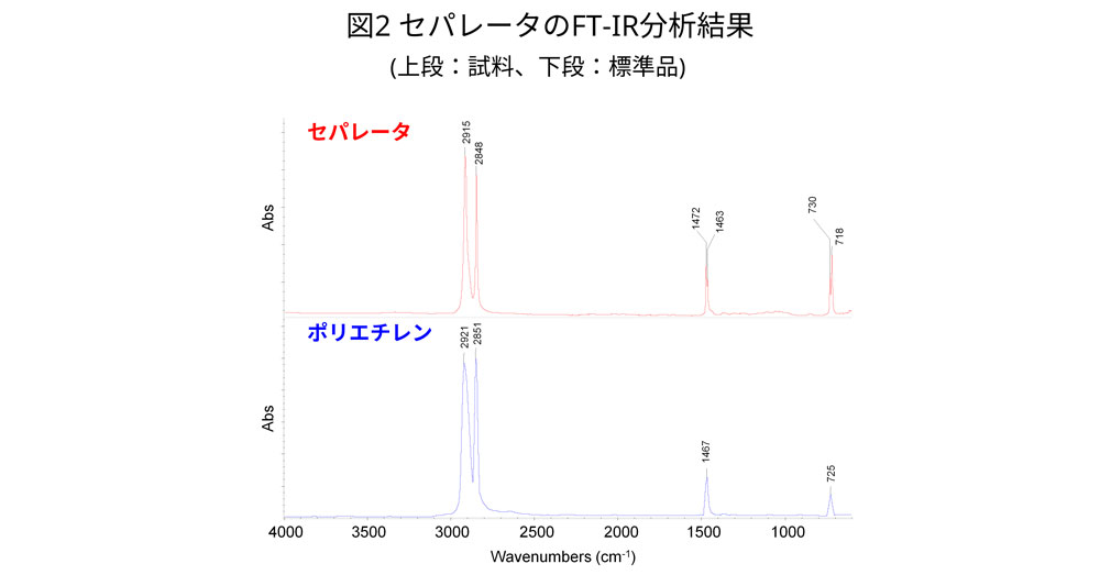 図2の上段は、セパレータのFT-IR (フーリエ変換赤外吸収分光) 分析結果です。得られたIRスペクトルは下段に示した標準品のスペクトルと一致することから、セパレータはポエチレンと定性されました。