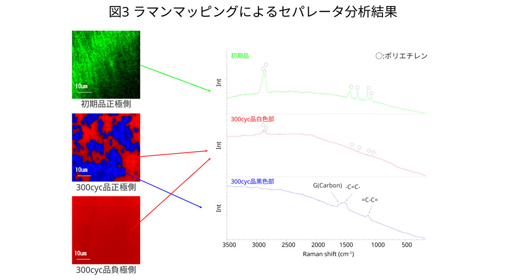 図3は電池から取り出したセパレータをラマンマッピングにより分析した結果です。初期品はポリエチレンのピークが明瞭に検出されています。