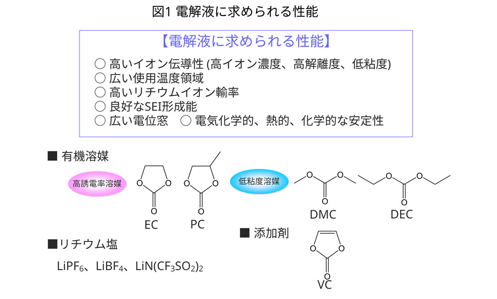 電解液は、電池の高性能化を目指す上で、非常に重要な役割を果たします。図1に電解液に求められる性能を示します。このように、電解液には多くのことが要求され、これらの課題をクリアすることで高出力・高容量・長寿命などの電池の高性能化が達成されます。電解液が電池内でどのような変化をするかを調べることは電池の高性能化に向けての重要な情報になります。