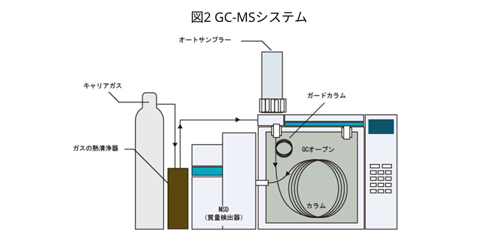 GC-MS (ガスクロマトグラフ-質量分析法) では、電解液を導入口で気化させ、その成分をカラムで分離したうえで質量分析計に導入して分析しています (図2)。これらにより、各成分を同定し、またそれぞれの濃度を求めることができます。また、その検出感度は非常に高く、ppb~pptレベルの微量成分も検出できるのが特長です。