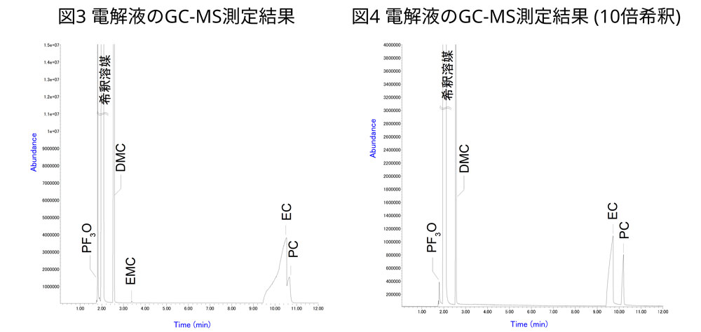 図3,4に示すGC-MS分析の結果から、エチレンカーボネート (EC)、プロピレンカーボネート (PC)、ジメチルカーボネート (DMC)、そして微量のエチルメチルカーボネート (EMC) が検出されました。また、定量結果は表1のようになりました。