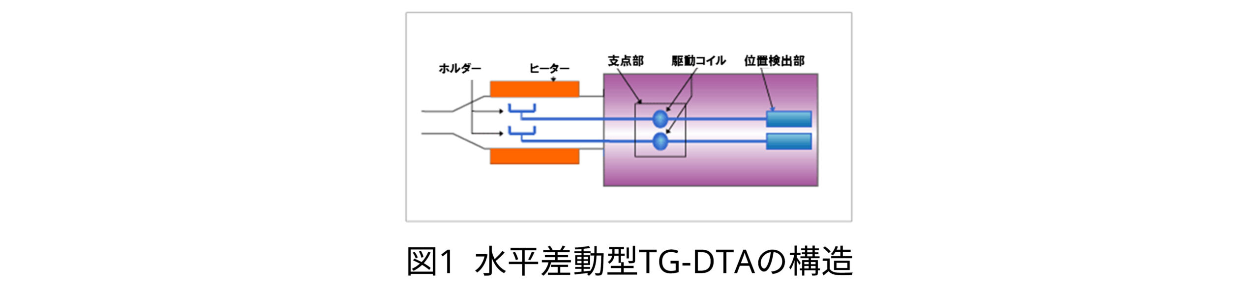 まず、試料から電極合材を掻き取り、これを専用容器に入れて水平差動型のTG-DTAのホルダの上に乗せます (図1)。加熱炉に導入して加熱していき、それに伴う試料の分解、脱水などの重量変化を精密に計測することで量を調べることができます。