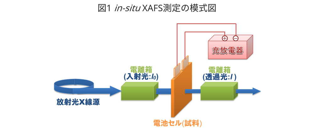 in-situ XAFSを用いてリチウムイオン二次電池の正極活物質の構造解析ができます。