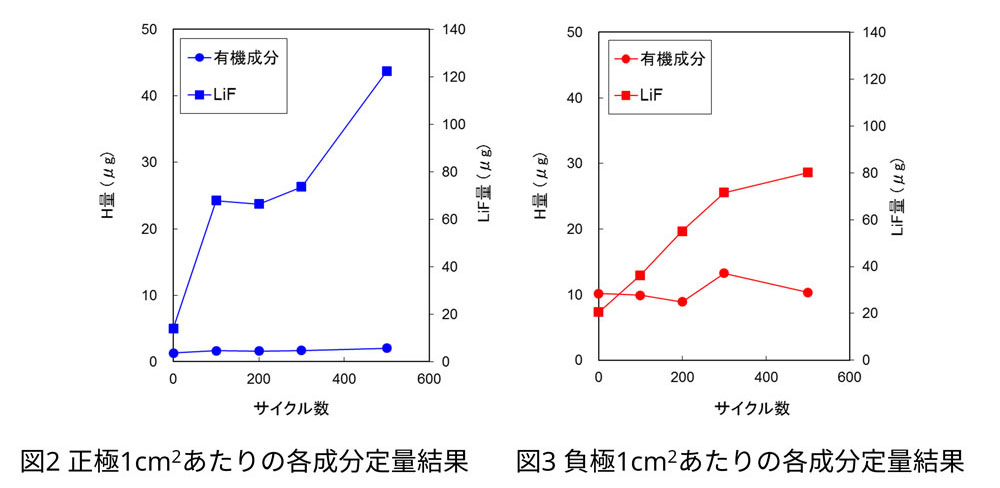 図2に正極、図3に負極SEIの有機成分とLiFの定量結果を示します。正極、負極ともにサイクル数の増加にともないLiFが増大している様子がみられます。一方、有機成分については初期品からほとんど増減がなく、正極よりは負極に多く形成されていることがわかります。
