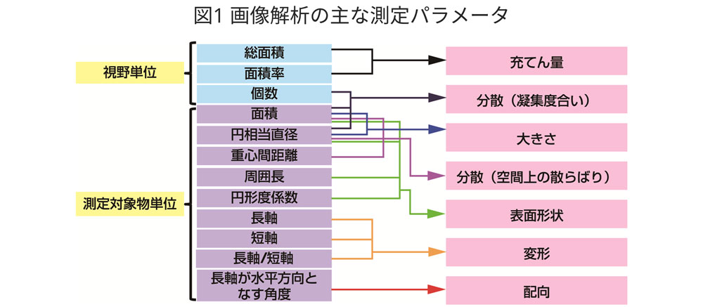 顕微鏡法の利点は、実際に観察することで対象物の状態を視覚的に捉えられることです。しかし、大小や散らばり、充填度合など画像からの印象だけでは試料間の比較が難しい場合があります。そのような際に画像解析を行うことで、これらの情報を数値化することができ、比較しやすくなります。