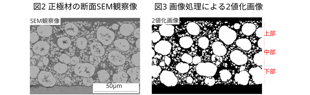活物質の粒径やその分散状態、断面における活物質の面積率がわかります。活物質の形状や分散状態はリチウムイオンや電子のパスに影響しますのでこれらを知っておくことは電池性能の理解に役立ちます。
