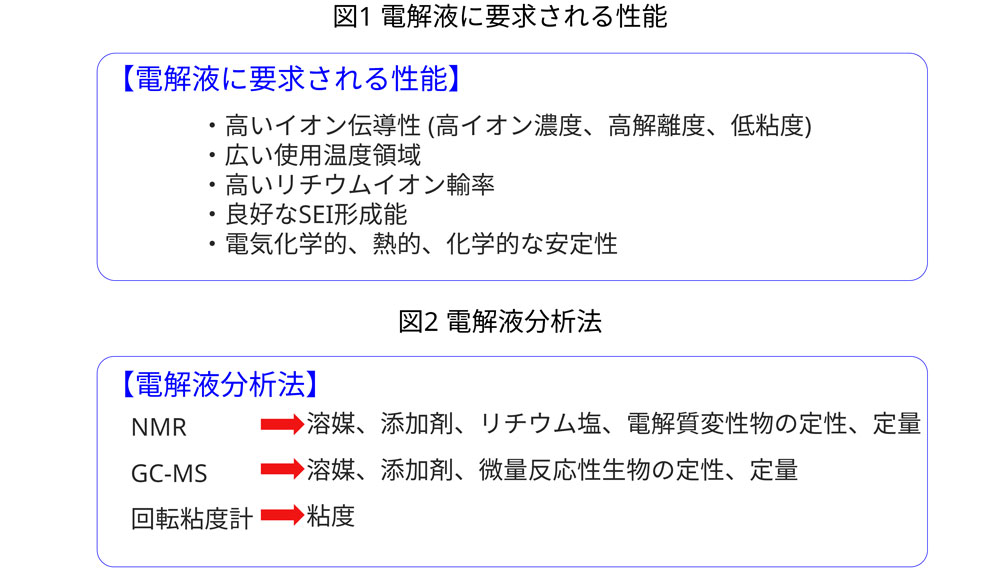 電解液は使用環境において溶媒の揮発、熱、水分等の影響を受けると組成が著しく変化し電池性能が低下してしまいます。電解液の主溶媒の組成や、添加剤、電解液の分解物等の化合物種とその含有量は NMRや GC-MSを用いることで詳しく調べることが出来ます。さらに充電・放電時の電極間を移動するイオンの動き易さに影響をおよぼす粘度を調べることで、電解液の劣化状態を相補的に得ることができます。