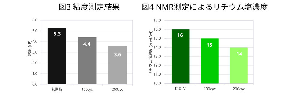 市販品電池の電解液について、粘度測定およびNMR測定を行いました。図3に示す粘度測定結果よりサイクル品はサイクルが増すごとに粘度の低下が認められました。また、表1に示すNMRによる電解液組成定量分析結果より、サイクル品はサイクルが増すごとにリチウム塩の減少と変性物の生成が認められました。上記結果から、電解液中のリチウム塩の分解によりリチウム塩濃度が減少したため、粘度が低下したものと推測されます。
