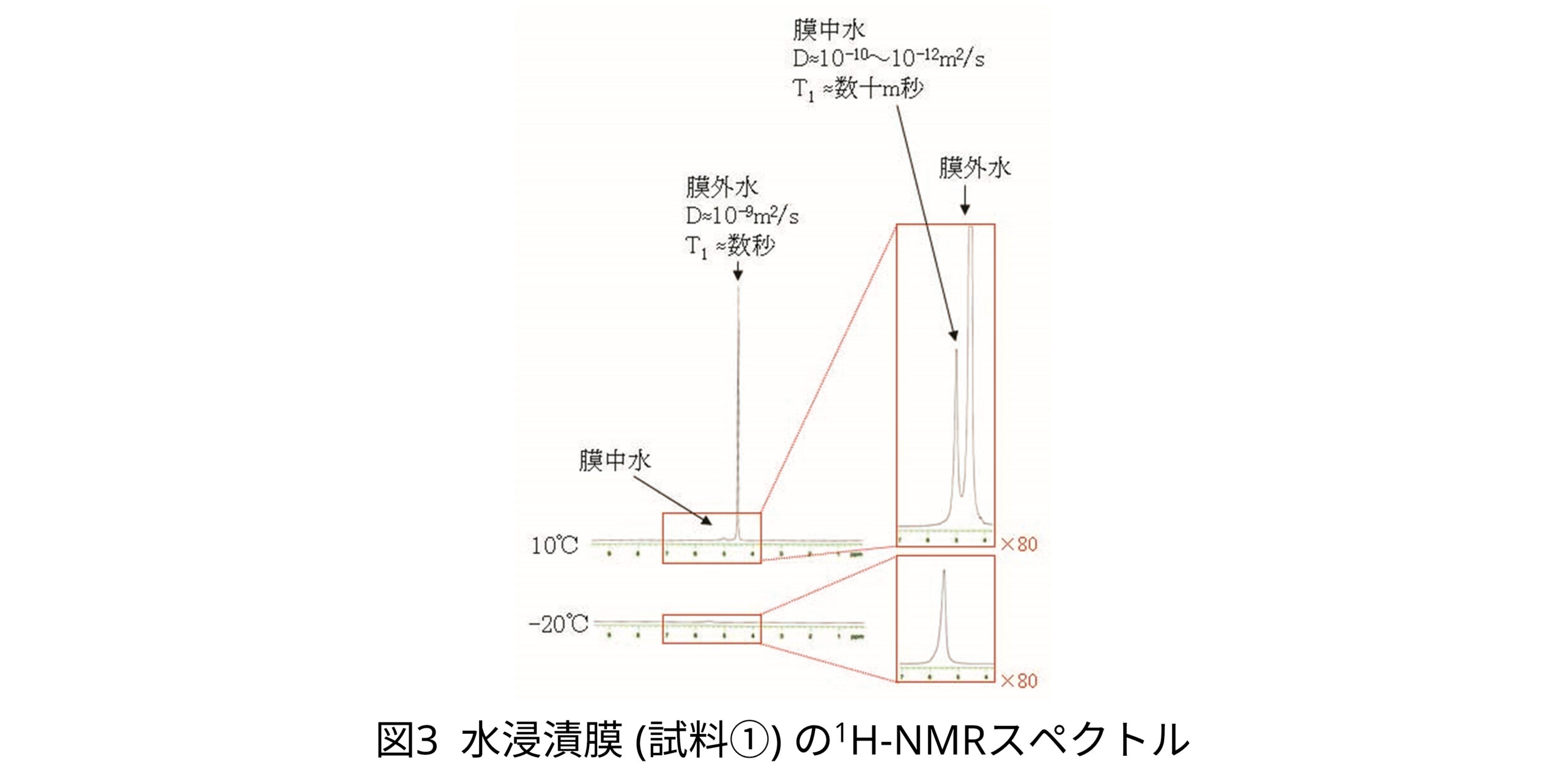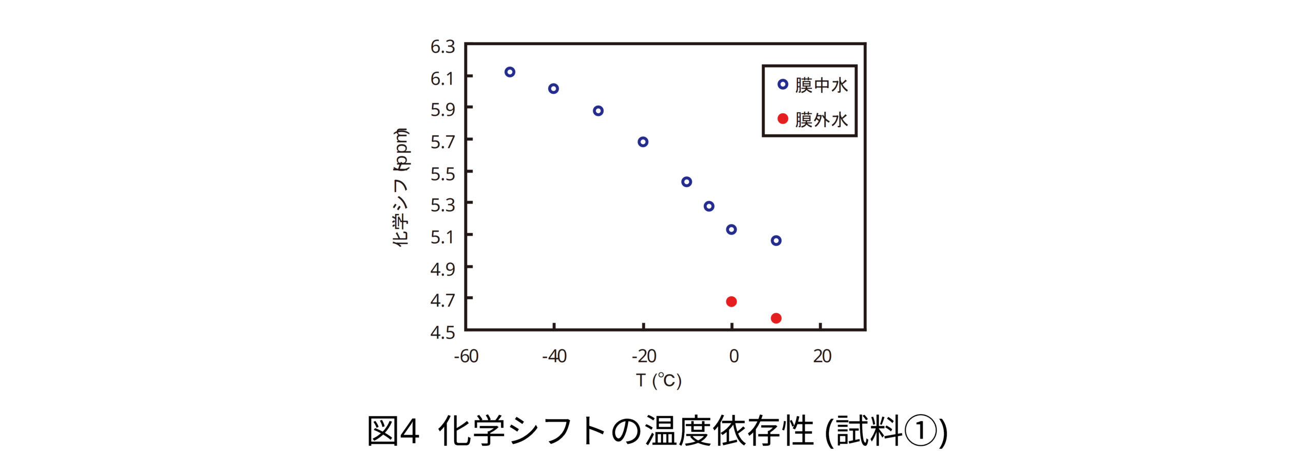 膜外の水は、0℃以下で凍結してピークが消失しますが、膜中の水は-50℃においてもピークが観察され、極めて低温でも凍結せずに運動していることがわかります。