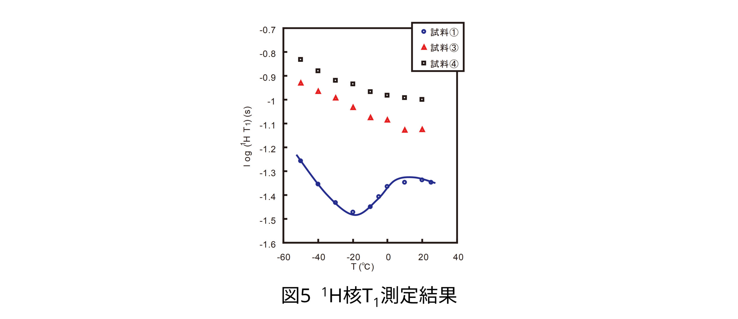 試料①、③および④について測定した、膜中の水の緩和時間T1の温度依存性を図5に示します。含水率の最も高い試料①でのみ-20℃付近に極小値が観察されています。