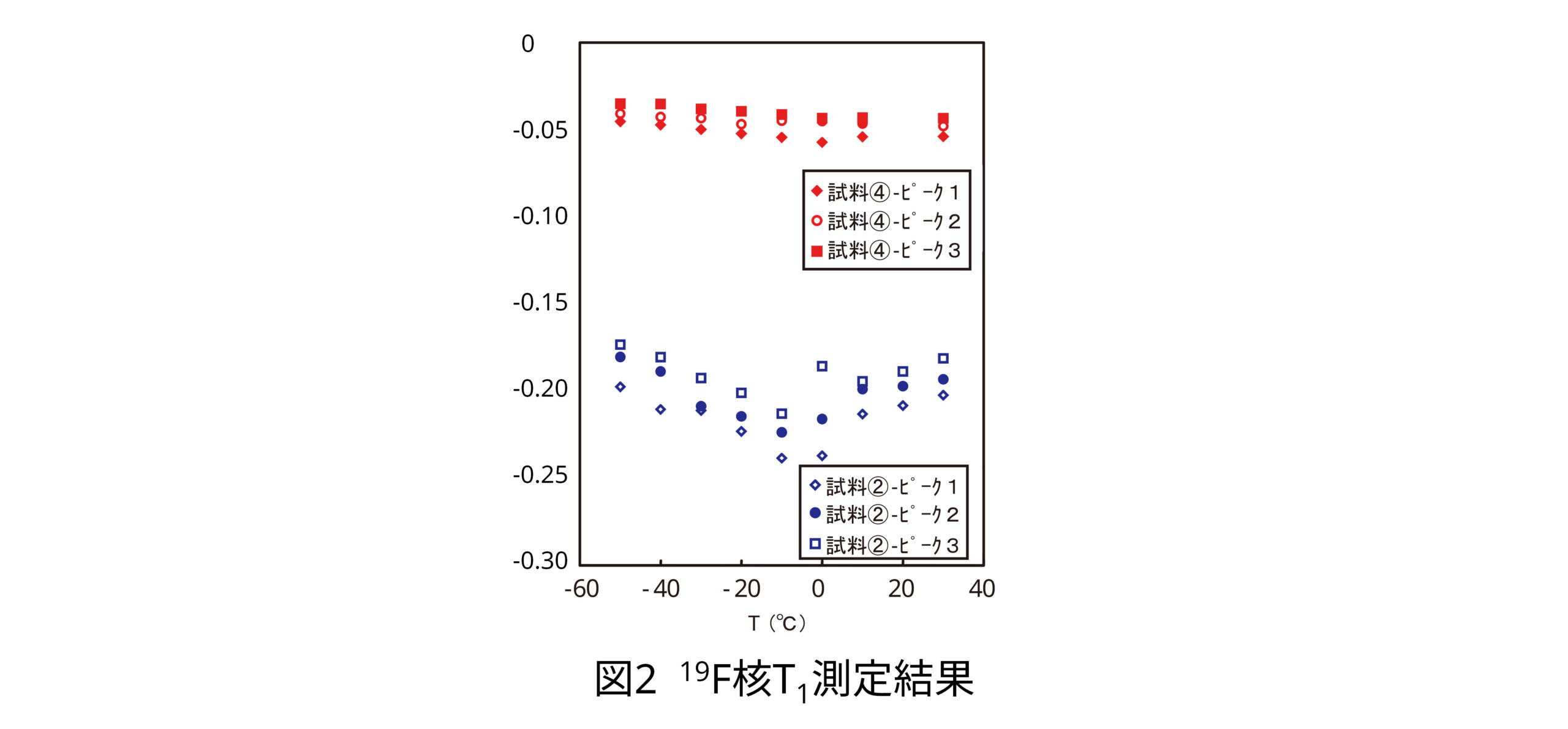 試料②と④について、-50~+30℃の間で固体19F NMRによるスピン-格子緩和時間T1を測定しました。温度可変測定により、試料の運動性を反映した緩和時間の変化が観測されます。主なピークの温度に対する緩和時間を図2に示します。