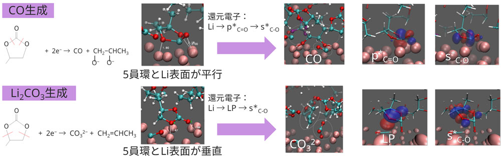 The products identified in the simulation of the reductive decomposition reaction of PC molecules on Li metal surfaces are consistent with experiments.
