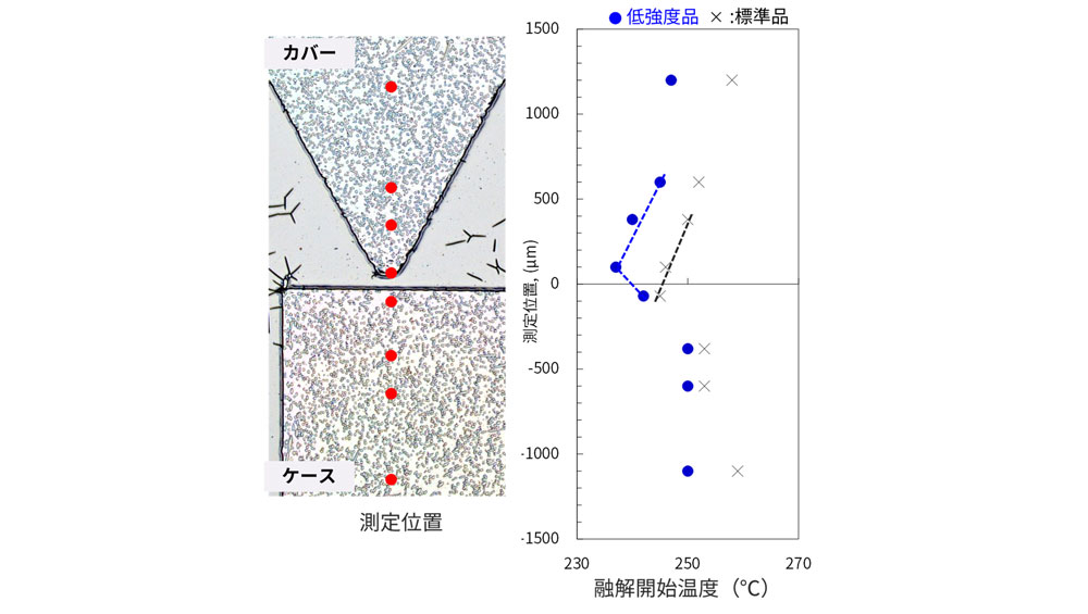 The cover of sample A, for which the mold temperature was set lower, had a lower melting start temperature of the material, so that only the resin on the cover side flowed during welding and was not compatible with the case, resulting in a lower weld strength.