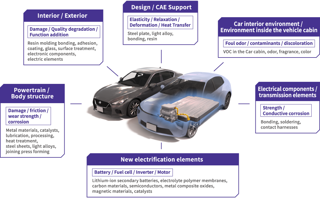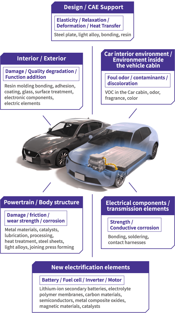 As a company that was spun off from an automotive company, we have a wealth of experience in supporting the research, development, production, and market quality of automobiles, which are composed of many components. We provide support to solve problems that occur not only with individual materials, but also with various components and assemblies, based on our knowledge of various phenomena and comprehensive analysis and consideration.