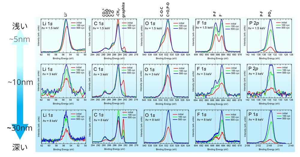 リチウムアルキルカーボネート (LAC) といった有機SEIやLiPF6は表面側に多く存在し、Li2CO3やLiFといった無機SEIは内部側に多く存在していることがわかりました。