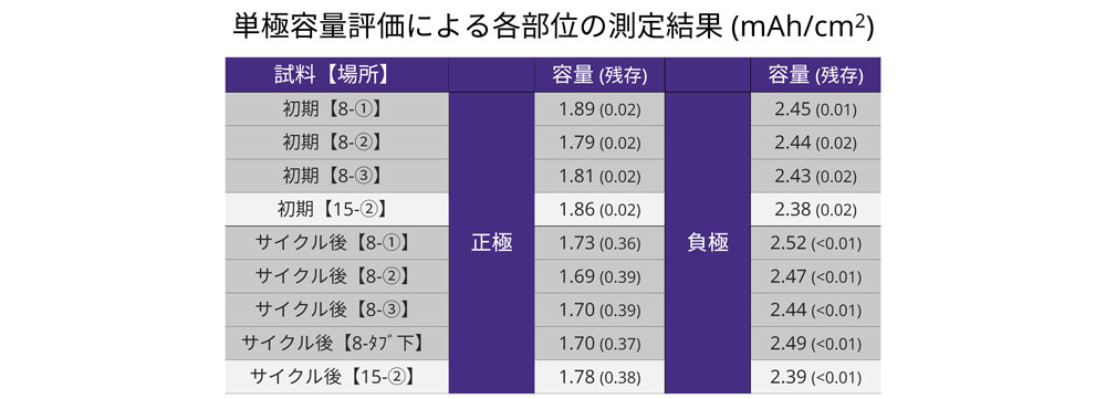 サイクル後:層内における場所依存性が確認された (負極タブ下)