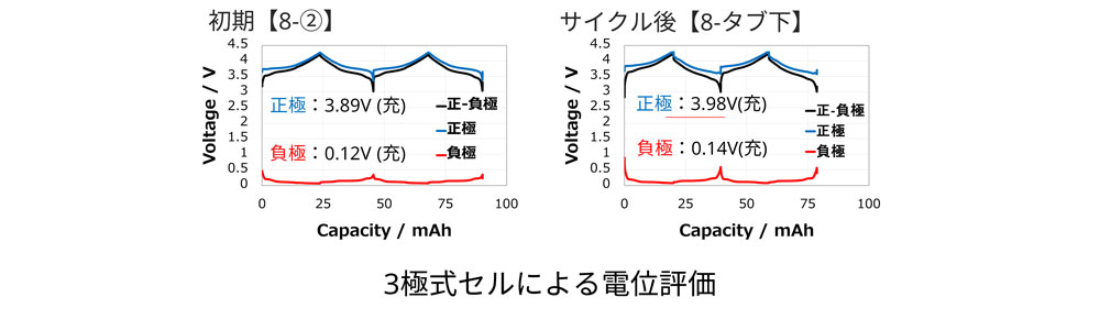 サイクル後:正極 (容量~6%減) 、負極 (容量減少無)