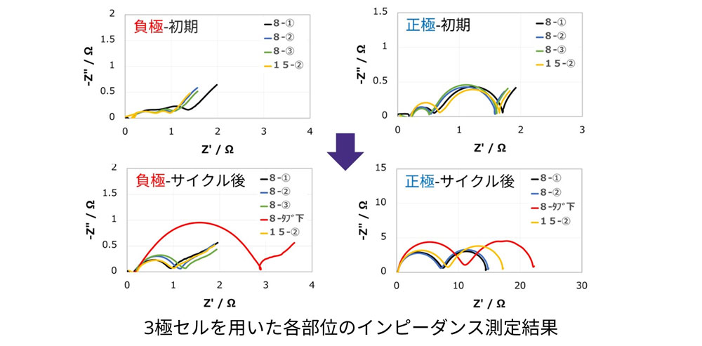 サイクル後:【正極】界面抵抗が1ケタほど増加、【負極】大きな変化は無い
