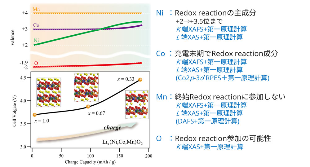遷移金属系材料に対する従来のXANES解析では、参照物質のスペクトルとの照合による価電子状態の特定に限定されていました。そこで、XANESと第一原理計算の融合的アプローチによる価電子状態の評価方法を開発し、リチウムイオン二次電池用正極材料 Li(Ni1/3Co1/3Mn1/3)O2に適用することで、同材料の構造および電気化学反応の詳細を解明しました。