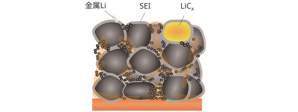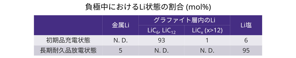 充放電を繰り返して電池の劣化が進むと、負極中に移動できないリチウム (カーボン層内のLi、SEI中のLi塩、金属Liなど) が生じます。それらの電池反応に寄与しないLiの有無は、容量低下や安全性に深く関係するため、その状態や量を知ることはとても重要です。
