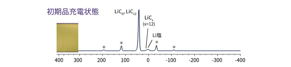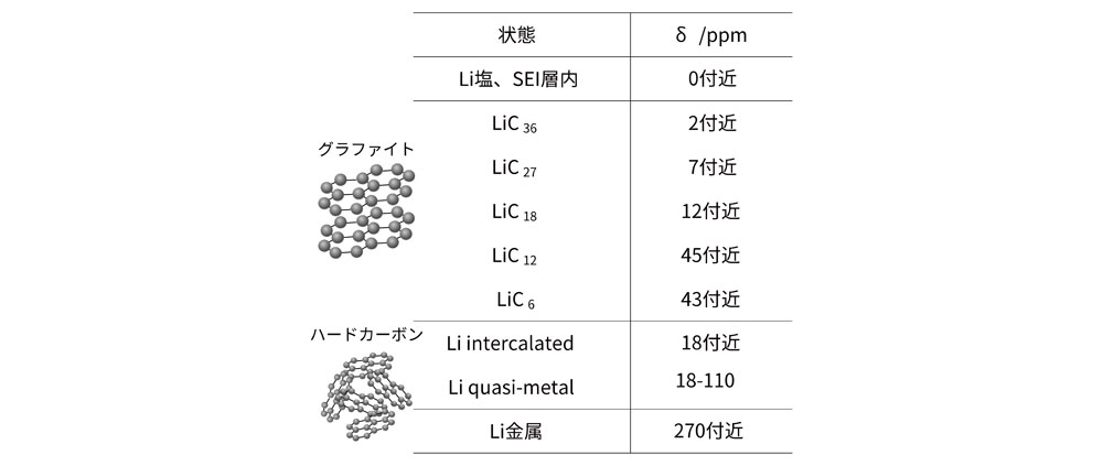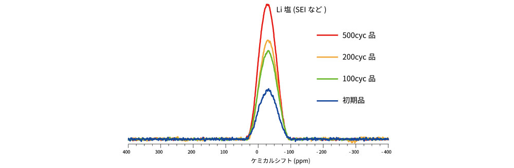 Li NMRではLiの状態により化学シフト値が異なるため、負極中Liの状態を定性し、それらの相対量を把握することができます。さらに、ICPにより求まるLi絶対量と合わせて解析することによって、各Li状態の定量が可能です。