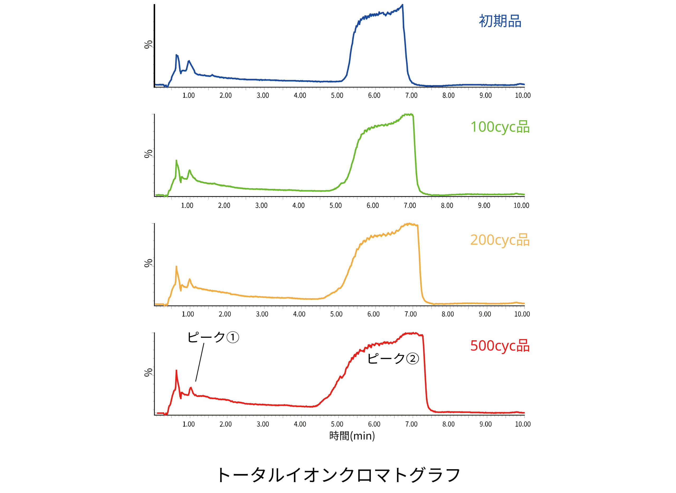 サイクル数の増加にともない、ピーク②成分は増大し、ピーク①については初期からほとんど増減がない様子が確認できました。