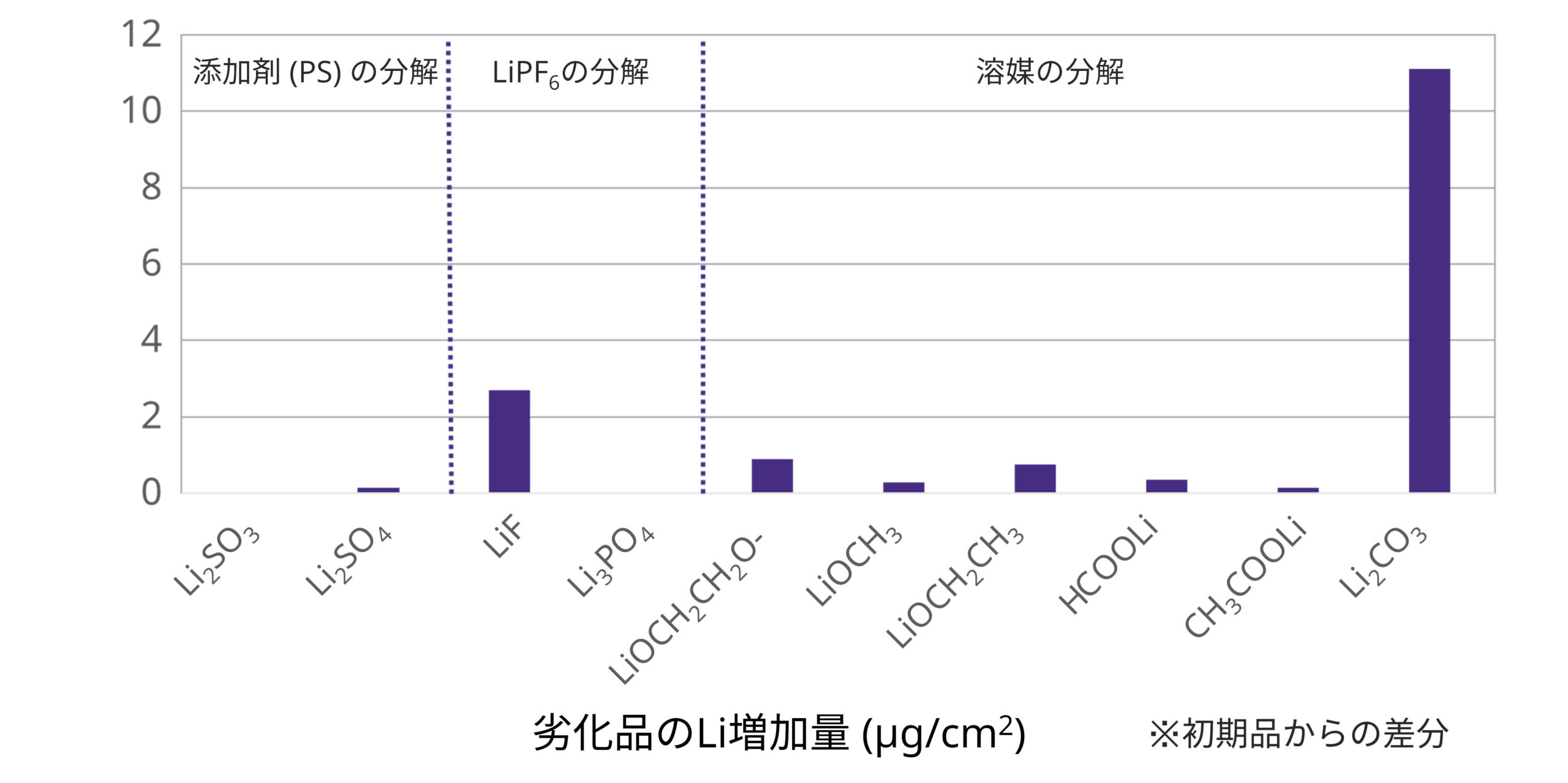 Li化合物の定量分析により、容量低下因子の抽出が可能です。