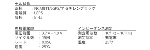 日産アークでは全固体電池の試作サービスを開始しました。全固体電池用の構成材料 (活物質・固体電解質・導電助剤) について、Arグローブボックス内での圧粉体セル試作により特性評価が可能です。使用する材料に合わせてセル作製のパラメータを最適化することにより、低抵抗なセルでの適切な材料評価を実施します。