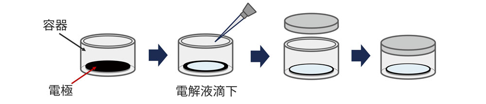 打ち抜いた電極を容器に入れ、電解液を滴下し、封をした後、DSC測定を行います。前処理は全てAr雰囲気グローブボックス内にて行いますので、大気非暴露測定が可能です。