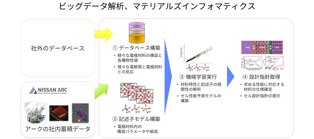 第一原理計算をベースとする計算科学、実験計測と連動したスペクトルシミュレーション、機械学習法によるスペクトル解析、マテリアルズインフォマティクス、実験データとシミュレーションを組み合わせたプロセス最適化など、日産アークのオリジナル計算技術を用いたソリューションを提供します。