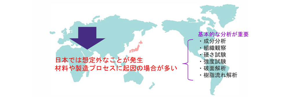 グローバルなクルマづくりが進められている中、生産拠点の移転に伴い、製造部品の品質確保が大きな課題になっています。材料検査はもちろん不具合が発生した際の材料・原因調査は、的確な仮説の構築や分析方法の選択など、豊富な経験や知識が必要になります。