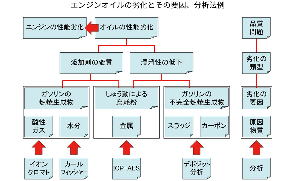 エンジンオイルの劣化解析では「酸」「水分」「金属」「デポジット」の分析が不可欠ですが、原因物質に合わせて最適な分析法の選択が必要です。