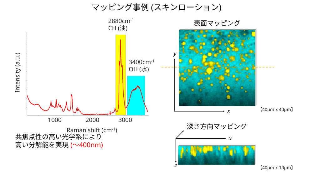 塗布前後でアミドⅠのマッピング像 (形状) に変化が見られないことから、 乳液下で細胞間脂質層は膨潤していないことが確認できました。また、乳液成分の分布についても確認できました。