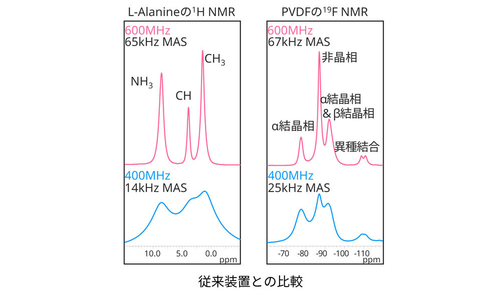 ポリマーや常磁性材料の高分解能1H,19F NMR測定、リチウムイオン電池の正極材の高分解能 Li NMR測定等に有効です。