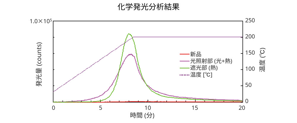 本試料は光+熱劣化と、熱劣化の領域が得られるように、半分をアルミホイルで覆い劣化試験を行いました。可視化像、UV-FL像による外観観察結果は、光+熱劣化部分ではともに劣化が確認できますが、熱劣化部では確認できません。この熱劣化部分を化学発光分析で確認すると、発光ピークが認められ、酸化劣化していることがわかりました。このように従来法では検出されないレベルの劣化でも、感度よく検出することができます。