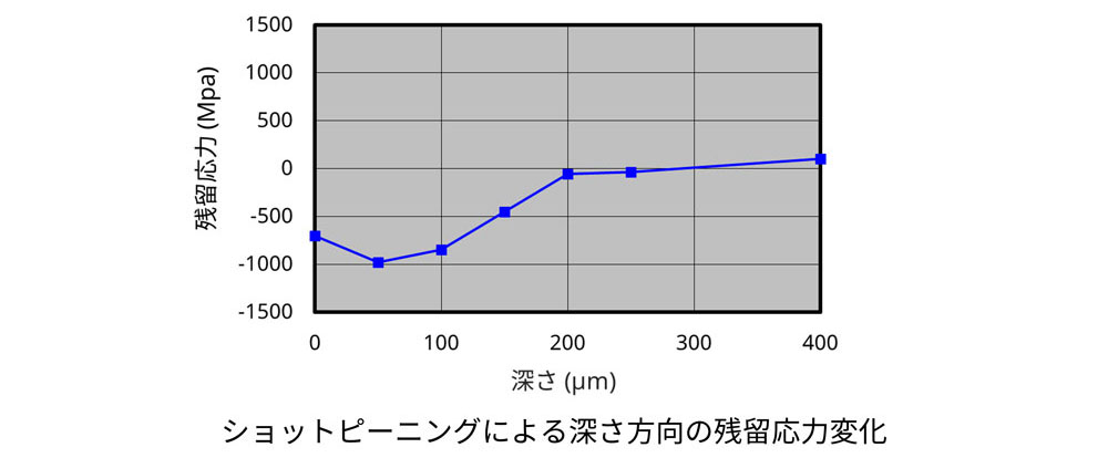 ショットピーニングは硬質粒子を部品表面に衝突させることで、表層に塑性変形による加工硬化と圧縮残留応力を付与する処理です。これが繰り返しの引張り応力を緩和することで、疲労亀裂の発生や、亀裂進展を緩和させる効果があります。下図は測定部表面に電解研磨を施しながら、深さ方向に残留応力を測定した例であり、ショットピーニング処理を最適化することに役立ちます。